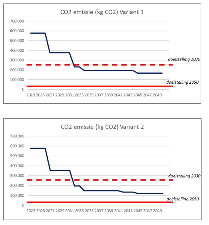Dit IHP gaat uit van een doorkijk over 15 jaar (tot circa 2038), daarmee wordt inzichtelijk of de klimaatdoelstellingen van 2030 worden gehaald. In het vorige hoofdstuk zijn de verschillende ‘gebouwmaatregelen’ per locatie benoemd. In de CO2-reductieberekening zijn deze projecten opgenomen en doorgerekend. Hierbij zijn twee varianten doorgerekend, namelijk: