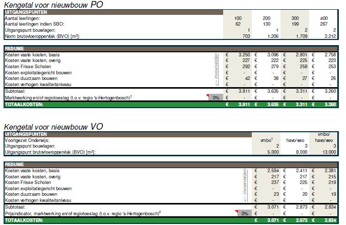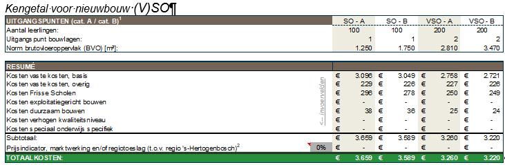 De bepaling van de kwaliteitsambitie leidt tot indicatieve stichtingskosten per m² brutovloeroppervlakte (bvo)3. De kostenkengetallen zijn berekend via de HEVO kostenconfigurator. De kosten zijn per m² bepaald op prijspeil 1 januari 2024 inclusief btw . Dit kostenkengetal is - in opbouw en benadering - gelijk aan de normbekostiging volgens de VNG. In de tabellen (figuren 6.2, 6.3 en 6.4) is toegewerkt naar een kengetal voor nieuwbouw op basis van de kostenconfigurator, waarbij onderscheid is gemaakt naar PO, VO en (V)SO. In bijlage 2 is de volledige benadering opgenomen.