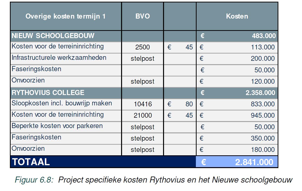 Onderstaand de kosten die zijn opgenomen voor de project specifieke kosten van het Rythovius en Nieuwe schoolgebouw (termijn 1):