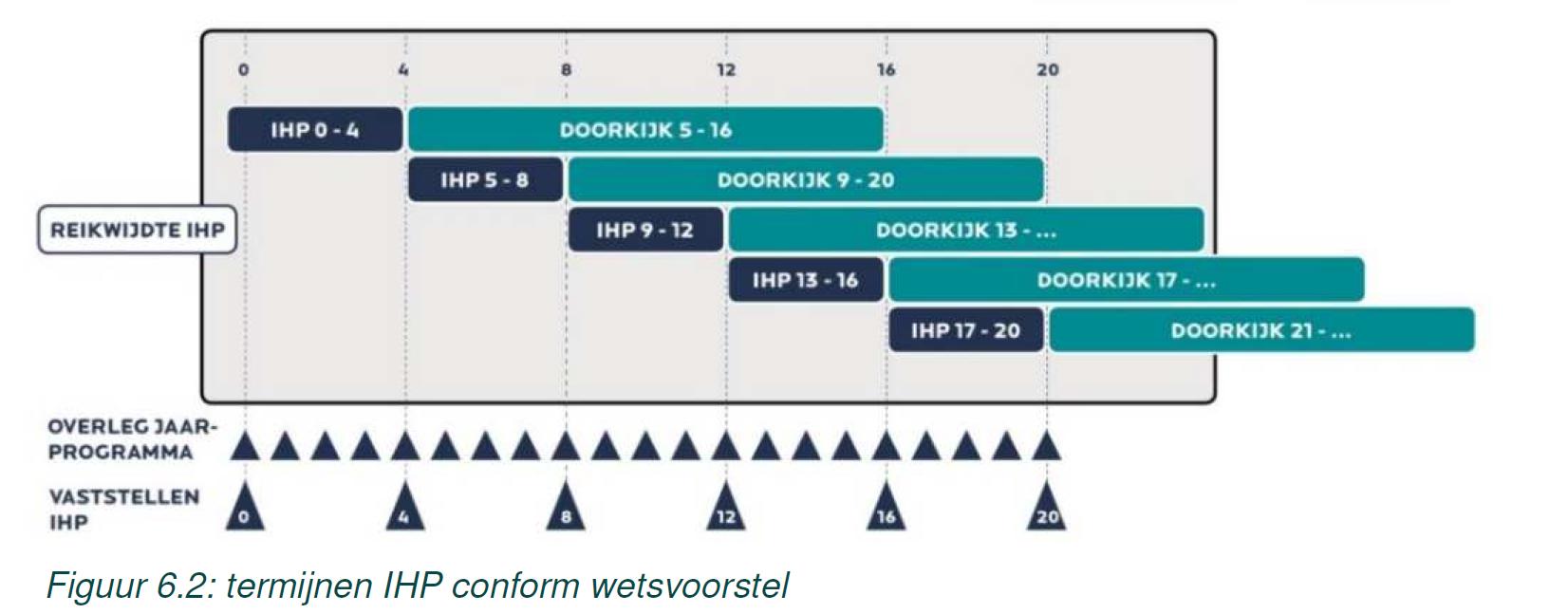 Het IHP werkt met termijnen (cycli) van 4 jaar en een scope van 15 jaar. Het IHP geeft inzicht in de projecten voor de looptijd van het IHP, waarbij de eerste termijn van 4 jaar het meest concreet is en de latere termijnen steeds meer indicatief zijn (doorkijk). Het actualiseren van het IHP duurt circa een jaar voor voorbereiding, ontwikkeling IHP en besluitvorming (2024). De eerste termijn is dus de periode 2024 tot 2027. Drie jaar na vaststelling van het IHP (2027) dient het IHP geactualiseerd te worden. De gemeente neemt het initiatief om de schoolbesturen uit te nodigen voor het herijken van het IHP.