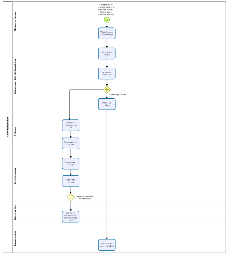 Calamiteiten kunnen niet altijd voorkomen worden. Wel kunnen maatregelen genomen worden om de gevolgen van calamiteiten te beperken. Om schade aan analoge archieven tijdens een noodsituatie te beperken of te voorkomen, is het nodig om de hiervoor te nemen maatregelen vast te leggen in een calamiteitenplan. Hiermee kan bij calamiteiten snel actie worden ondernomen.
