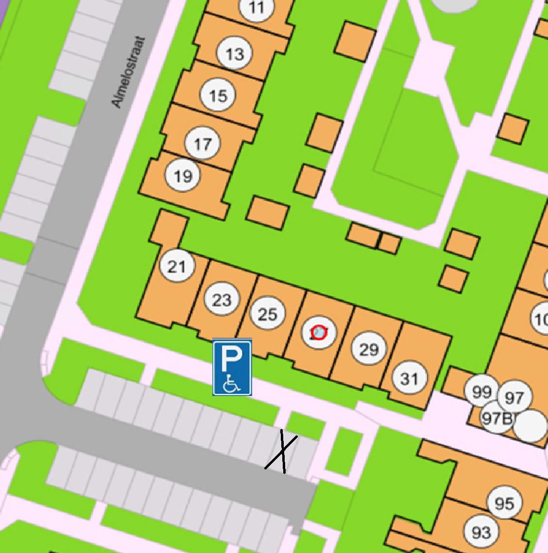 De afdeling Stadsruimte van de gemeente Almere heeft vanuit de afdeling Zorg & Welzijn een verzoek ontvangen voor het aanwijzen en inrichten van een gehandicaptenparkeerplaats op kenteken. De aanvraag voor de gehandicaptenparkeerplaats is ingediend en getoetst bij de afdeling Zorg & Welzijn. Na het toetsen van het recht op een gehandicaptenparkeerplaats heeft de desbetreffende wijkregisseur een plek aangewezen.
