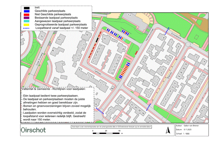de betreffende laadpaallocatie is in eerste instantie bepaald op basis van een plaatsingsleidraad Vattenfall dat voorziet in (27) basiscriteria en vanuit de verschillende beheerdisciplines is de locatie nader bekeken en geschikt bevonden, zodat er een passende invulling gegeven wordt aan de Oirschotse inrichting van de openbare ruimte. Een nadere uitwerking van de analyse is weergegeven in bijlage 3 Analyse laadpaal plaatsen;