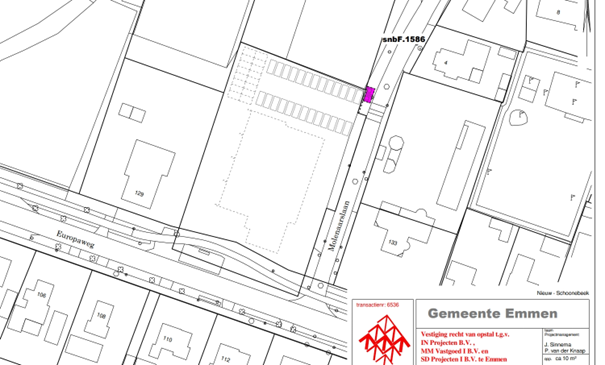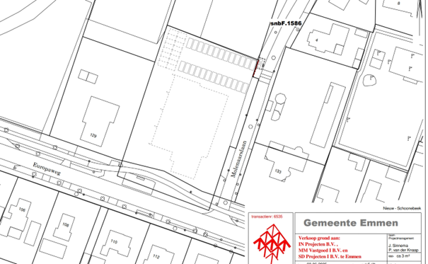 IN Projecten BV, MM Vastgoed I BV en SD Projecten I BV zijn tezamen eigenaar van een perceel gelegen op de hoek Europaweg en Molenaarslaan te Nieuw-Schoonebeek. Zij wensen aldaar een wooncomplex te realiseren bestaande uit 16 appartementen, 16 bergingen en voldoende parkeergelegenheid. Voor de realisatie van dit complex heeft de eigenaar een perceeltje van 3 m2 nodig. De gemeente Emmen is bereid bovengenoemd perceel aan IN Projecten BV, MM Vastgoed I BV en SD Projecten I BV te verkopen.