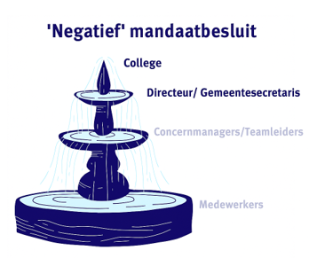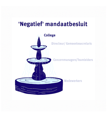 Zo maken we het zo makkelijk mogelijk. Het college wil de bevoegdheden zo laag mogelijk in de organisatie leggen. In principe heb jij als medewerker binnen jouw werkterrein daardoor overal mandaat voor. Tenzij het college het heeft opgenomen in een van de bijlagen in dit besluit. Je kunt het vergelijken met een fontein.