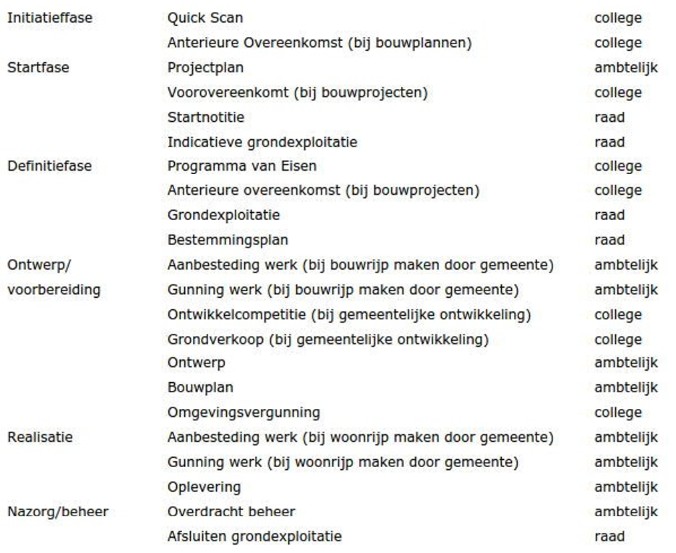 In de hieronder weergegeven matrix is de bestuurlijke besluitvorming en de beslissingsbevoegdheid van de gemeenteraad en het college van B&W ten aanzien van gemeentelijk grondbeleid kort weergegeven.