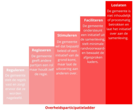 Bij overheidsparticipatie is de rol van de gemeente in principe faciliterend en meedenkend. Het eigenaarschap blijft bij de initiatiefnemer. De gemeente kan op verschillende niveaus betrokken zijn bij initiatieven uit de samenleving, variërend van reguleren tot loslaten (zie figuur 2: overheidsparticipatieladder). De gemeente kiest de rol die zij vervult op basis van de omstandigheden en de fase van het proces, waarbij het algemeen belang altijd centraal staat.