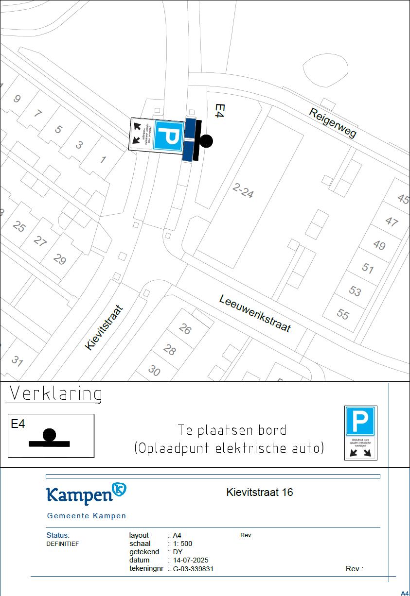 - door middel van het plaatsen van het verkeersbord E4 van bijlage 1 van het RVV 1990 met een onderbord met de tekst ‘opladen elektrische voertuigen’ – en een onderbord met pijlen, waaruit blijkt dat het bord voor twee parkeerplaatsen van toepassing is- op de Kievitstraat ter hoogte van nummer 16, een tweetal parkeerplaatsen te reserveren op het aangrenzende parkeerterrein ten behoeve van het opladen van elektrische voertuigen.