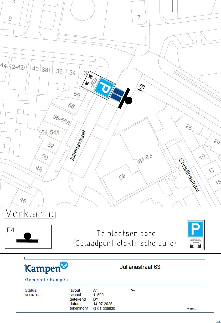 Verkeersbesluit gereserveerde parkeerplaatsen voor opladen elektrische voertuigen aan de zijkant van de Julianastraat 63 te Kampen