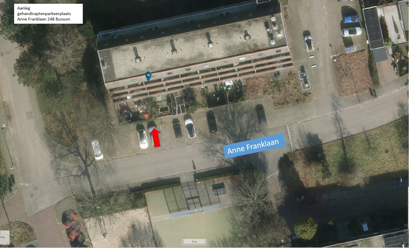 De gemeente Gooise Meren heeft naar aanleiding van een verzoek van een bewoner besloten om met behulp van een kenteken een gehandicaptenparkeerplaats voor de bewoner te reserveren ter hoogte van de woning met het adres Anne Franklaan 248, 1403HX Bussum. Op de situatietekening staat de beoogde locatie van de te reserveren parkeerplaats weergegeven.