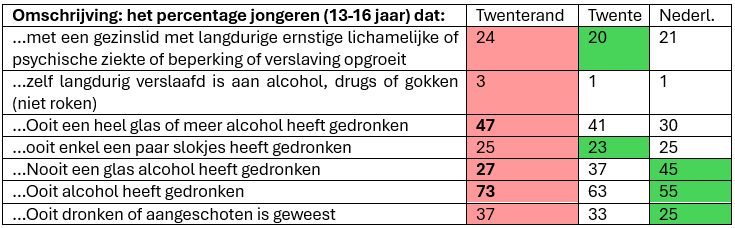 Noot: Afgeleid uit Gezondheidsmonitor Jeugd Twenterand 2023. Rood betekent slechter, groen beter. Dikgedrukt betekent dat er een significant verschil is met Twente dan wel Nederland.