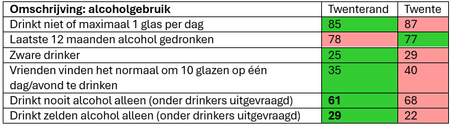 De cijfers voor alcoholgebruik onder 16 tot 25 -jarigen uit Twenterand zijn niet negatief. Daar waar de cijfers voor jeugd veelal rood kleuren is dat voor jongvolwassenen niet het geval. In Tabel 7 is weergegeven hoe Twenteranders zich op verschillende vragen verhouden tot Twente.