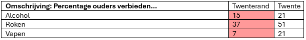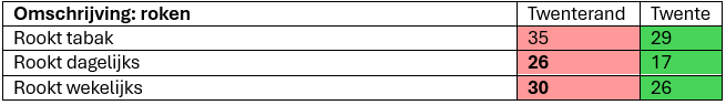 Noot: Afgeleid uit Gezondheidsmonitor Jeugd Twenterand 2023. Rood betekent slechter dan gemiddeld, groen beter dan gemiddeld. Dikgedrukt betekent dat er een significant verschil is met Twente dan wel Nederland.