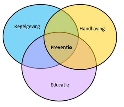 Het preventiemodel van Reynolds (2003) borduurt voort op de systeemtheorie van Holder (zie 4.2.) Het preventiemodel kent drie beleidspijlers: educatie, regelgeving en handhaving. De pijlers staan deels op zichzelf maar overlappen elkaar ook (figuur 5). Juist in de overlap is het integrale preventiebeleid terug te zien: het model maakt duidelijk dat niet alleen educatie maar ook regelgeving en handhaving bijdragen aan het voorkómen van (problemen door) alcoholgebruik.