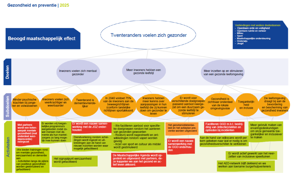 In dit plan leggen we de link met onze Maatschappelijke agenda en de doelenboom gezondheid. We werken in het programma gezondheid vanuit de ambitie weergegeven in onderstaande doelenboom. Dit is een lange termijn ambitie. Of de ambitie behaald is, kan pas op lange termijn worden gemeten. Het is niet mogelijk om het effect van dit plan gedurende de looptijd van dit plan te meten. Echter, enkele in dit plan opgenomen indicatoren die later aan bod komen, zullen ook het beoogd maatschappelijk effect van de inzet binnen het programma gezondheid op lange termijn weergeven. Onderstaand wordt dit verder weergegeven: