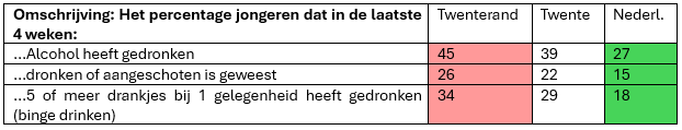 Zoals te zien is, scoort onze jeugd op het gebied van alcoholgebruik bij elke indicator slechter dan het gemiddelde van Twente en/of Nederland. Dit geldt ook voor alcoholgebruik van de jeugd in de vier weken voorafgaand aan de afname van de monitor.