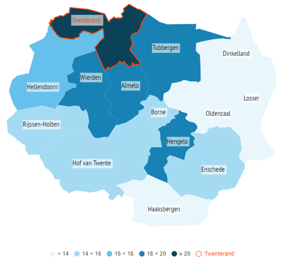Binnen deze kernen scoren vooral de wijken Vroomshoop-west (43%), Westerhaar-Vriezenveensewijk-west (43%), Vriezenveensewijk (42%), Westerhaar-west (42%) en Vriezenveen-centrum (48%) aanzienlijk hoger dan gemiddeld. Dit betekent dat in deze wijken juist meer voldaan wordt aan de alcoholrichtlijn. Opvallend is dat een groot deel van gemeente Twenterand zich niet aan de alcoholrichtlijn houdt.