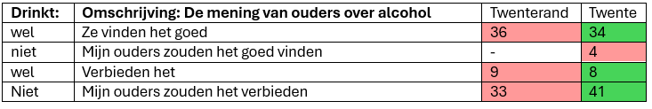 In Twenterand keuren niet alle ouders het alcoholgebruik van hun kinderen af. Dat ouders het alcoholgebruik van hun kinderen nog altijd niet geheel afkeuren, is af te leiden uit onderstaande tabel. Dit is de perceptie van de jongeren.