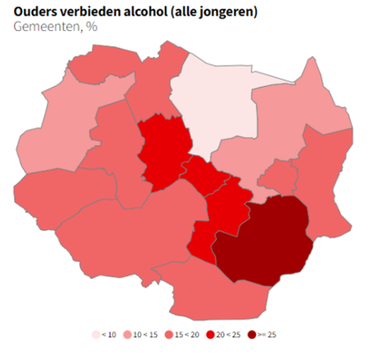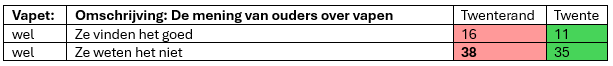 Vergeleken met de cijfers van alcohol is te op te maken dat ouders het roken meer afwijzen dan alcoholgebruik. Vapen daarentegen lijkt nog niet door veel ouders verboden te worden.