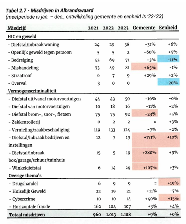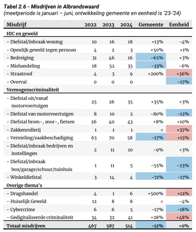 Het Gezamenlijk Veiligheidsbeeld van regio Rotterdam verschijnt twee keer per jaar en geeft inzicht in de veiligheidssituatie van de regio. Onderstaand zijn de cijfers 2021, 2022, 2023 en het eerste half jaar 2024 voor Albrandswaard weergegeven. Aangezien de aantallen misdrijven ten opzichte van de Eenheid Rotterdam over het algemeen laag zijn fluctueren de percentages bij kleine toe- en afnames snel.