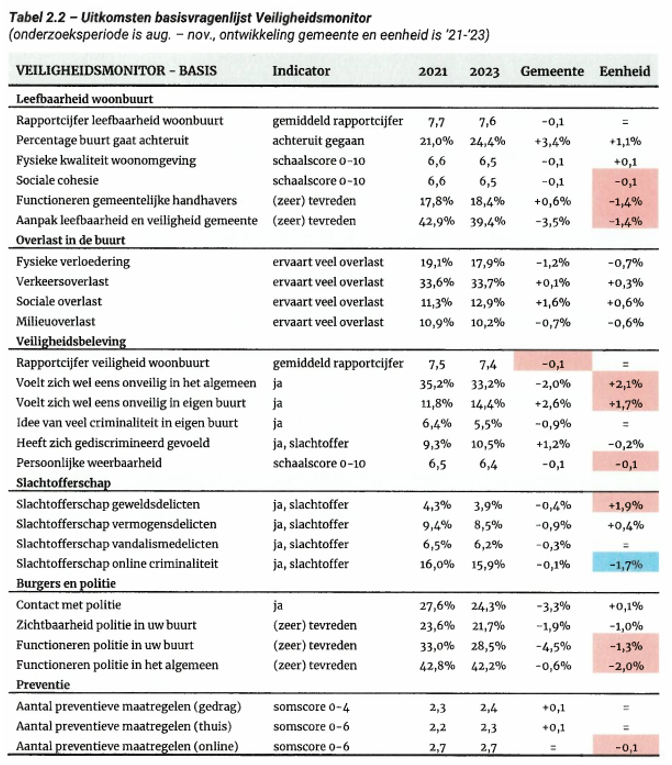Overlast in de buurt: Er zijn vier vormen van buurtproblemen (fysieke verloedering, verkeersproblemen, sociale problemen en milieuproblemen). De ervaren overlast is ongeveer gelijk gebleven ten opzichte van twee jaar geleden. Dit komt overeen met het stabiele beeld in de eenheid. Verkeersproblemen zorgen voor de meeste overlast (33,7% ervaart veel overlast) gevolgd door fysieke verloedering (17,9%). Deze thema’s hebben invloed op het veiligheidsgevoel, hierdoor is het van belang dat de gemeente integraal werkt aan een veilige en schone leefomgeving. Bij domein overstijgende problematiek zoeken we samenwerking met de andere domeinen binnen de gemeente.