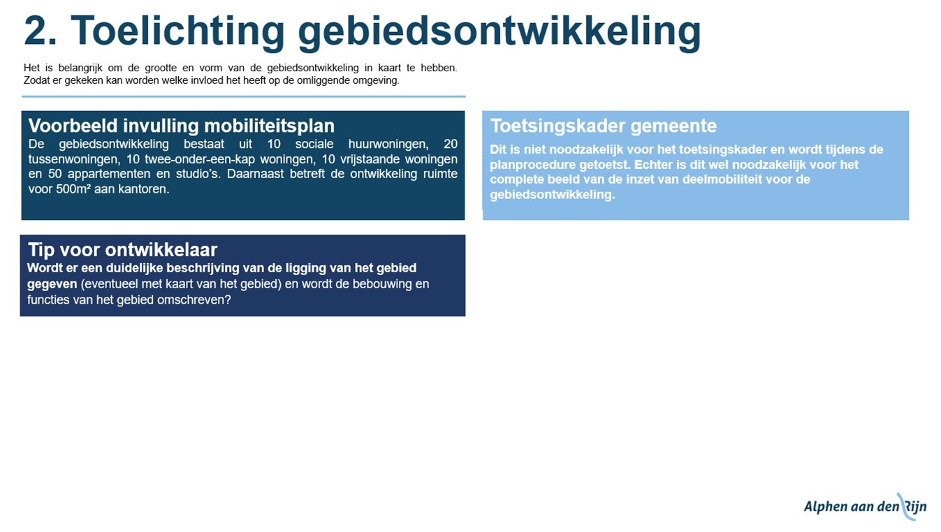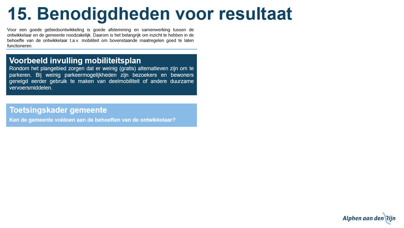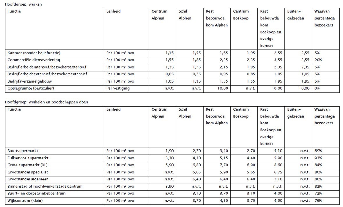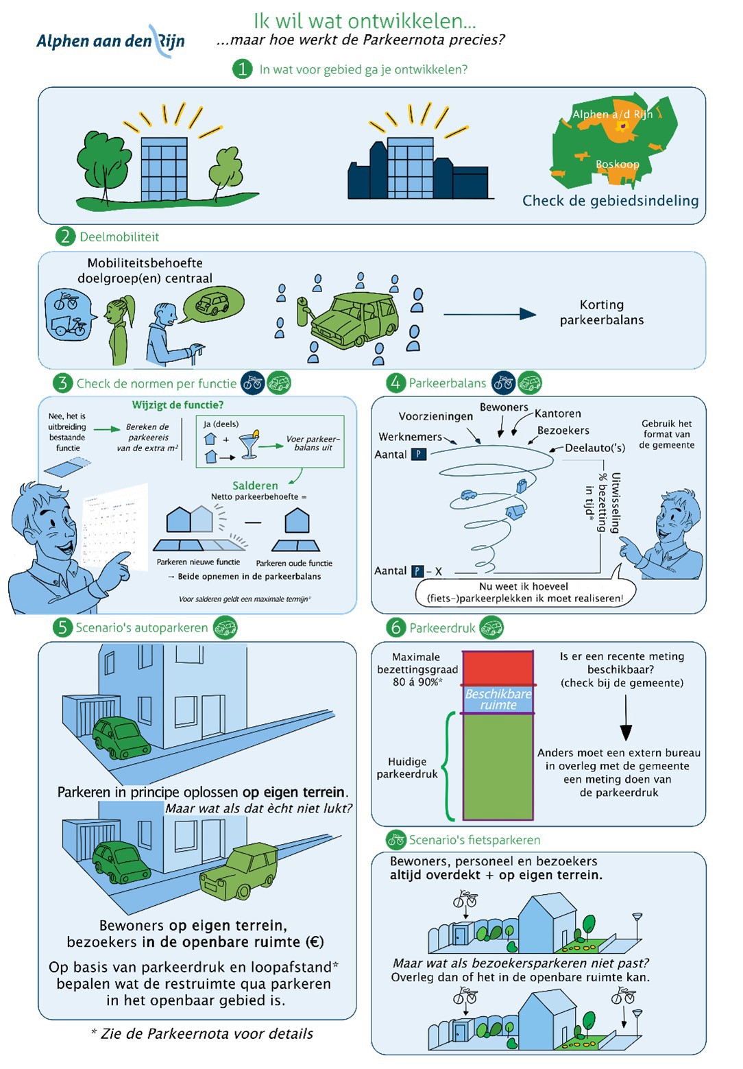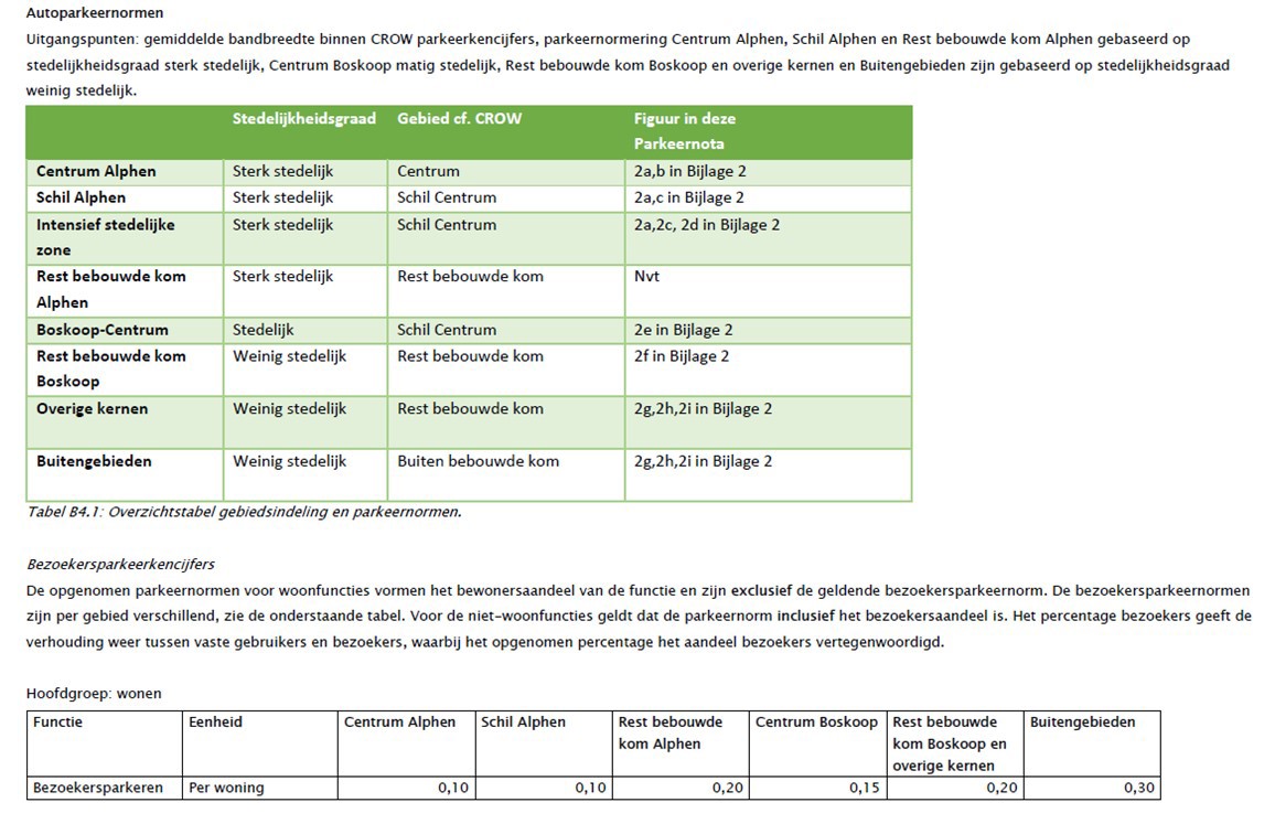 In Hoofdstuk 4: ‘Ontwikkelen: voor wie en waar?’ zijn beide uitgewerkt. Bij aanvragen voor een omgevingsvergunning van een nieuwe ontwikkeling toetst de Gemeente of een plan voldoet aan de regels van de Parkeernota. Deze regels gelden voor het volledige grondgebied van Alphen aan den Rijn.