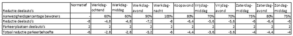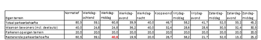 Voor andere dagdelen geldt dit effect wel. Bijvoorbeeld op de werkdagavond en koopavond is de parkeerbehoefte van het kantoor slechts 1,2 parkeerplaatsen, wat betekent dat het parkeerterrein op deze dagdelen grotendeels ongebruikt zal zijn. Zoals uit de tabel blijkt leidt dit ook tot een verschuiving van het maatgevende moment (van de werkdagmiddag naar de zaterdagmiddag).