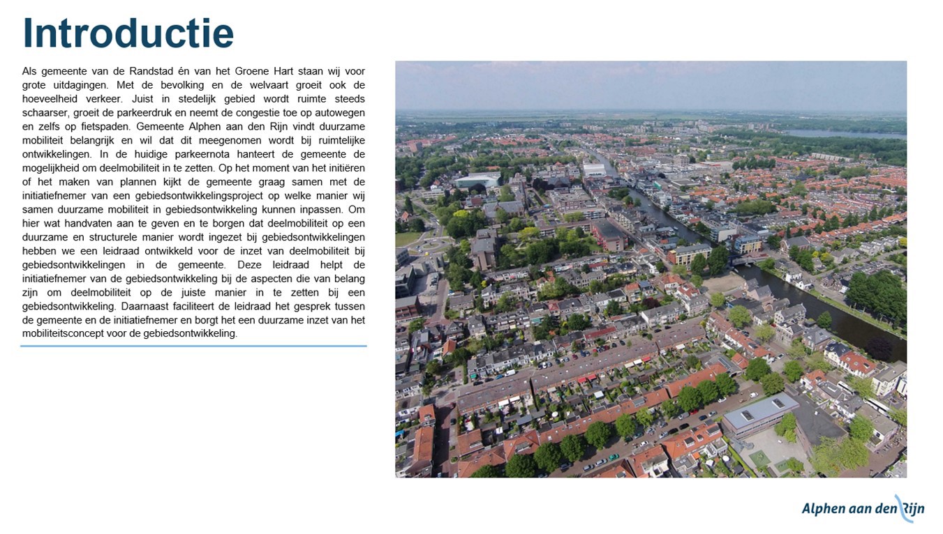 Alphen aan den Rijn is volop in ontwikkeling. Door de snelgroeiende bevolking is tot 2030 jaarlijks een toevoeging van 600 woningen noodzakelijk. Samen met andere ontwikkelingen leidt dat tot een uitbreiding van bebouwd gebied of tot verdichting van bestaande bebouwing (inbreiding). Bij inbreiding neemt ook het aantal auto’s in de bebouwde kom toe, met een groeiende vraag naar parkeerplekken. De nieuwe Nota parkeernormen Alphen aan den Rijn (hierna Parkeernota genoemd) houdt rekening met deze ontwikkelingen zonder ze onbegrensd te faciliteren. Er is een maatschappelijke trend om het autobezit en -gebruik juist te beperken. De Gemeente zet in op duurzaam vervoer, zoals fietsen, deelmobiliteit en openbaar vervoer.