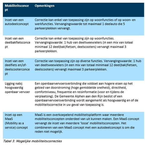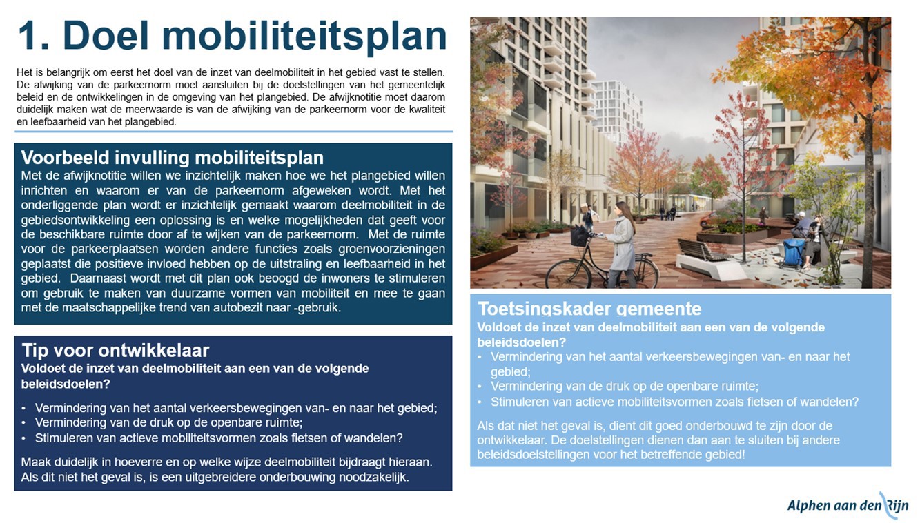 De Gemeente Alphen aan den Rijn stimuleert duurzame vervoersvormen, zoals fietsen en deelauto’s. Tegelijkertijd wil de Gemeente de bouw van woningen versnellen en verpaupering door leegstand tegengaan. Bij innovatieve woon- en parkeeroplossingen worden er mogelijk kortingen op de parkeernormen toegepast. Bijvoorbeeld bij gebruik van slimme parkeerconcepten of het inzetten van duurzame mobiliteit. Hiervoor is in de Parkeernota een maatwerkregeling opgenomen.