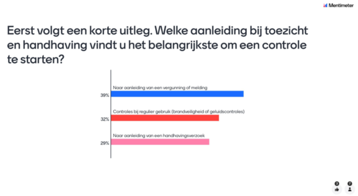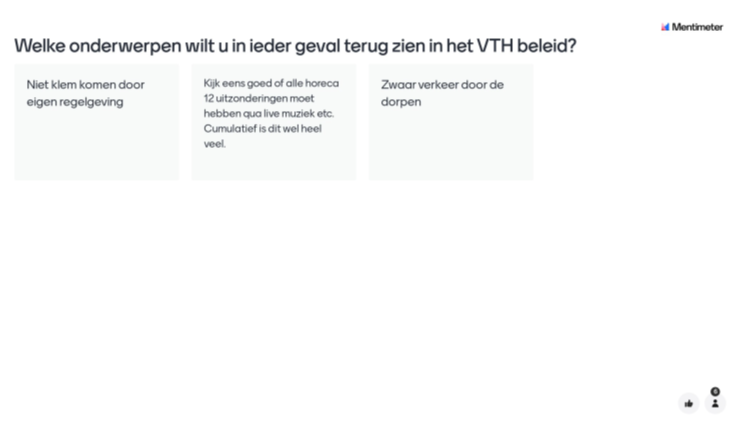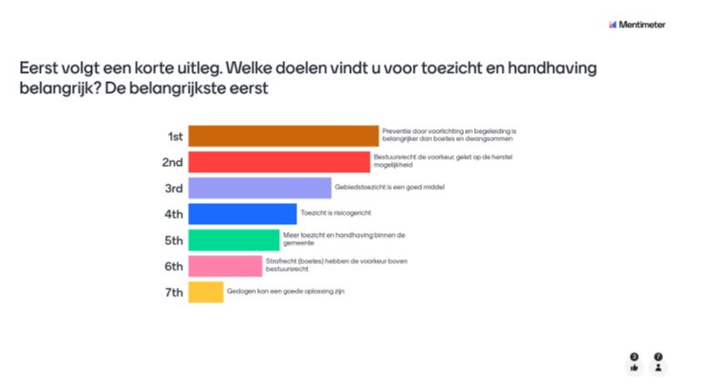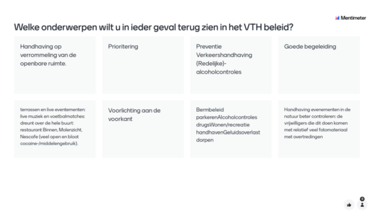 Op 29 oktober 2024 is een sessie gehouden met college en directie over het onderwerp VTH. Hierbij zijn de doelen voor vergunningverlening en toezicht en handhaving aan de orde gekomen. Er is onder meer gebruik gemaakt van de Mentimeter.