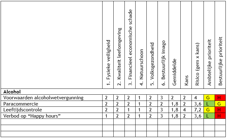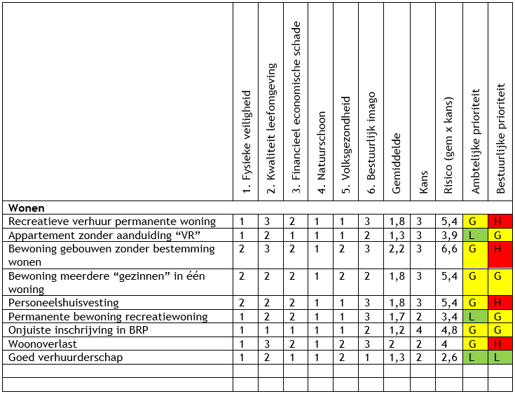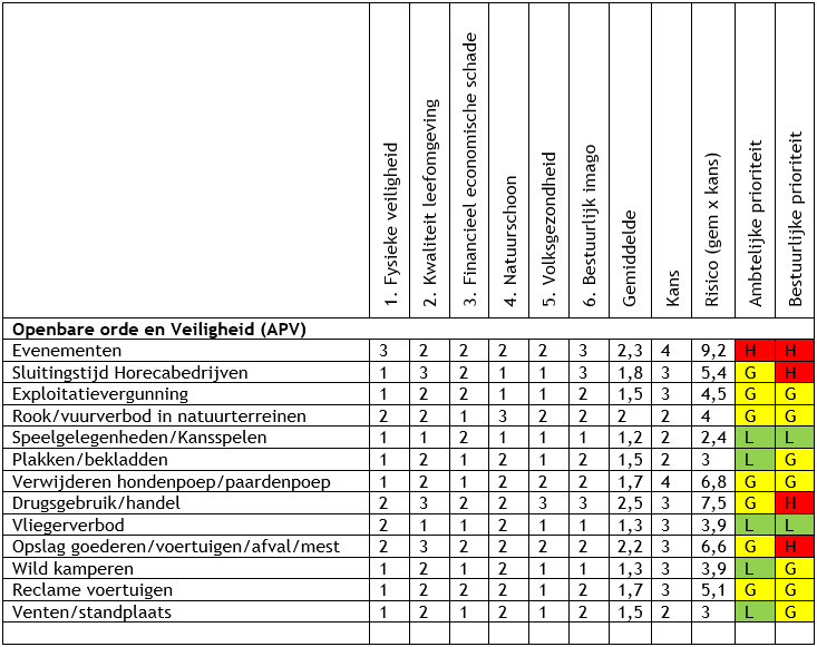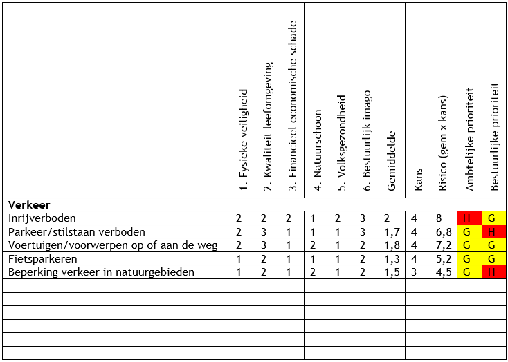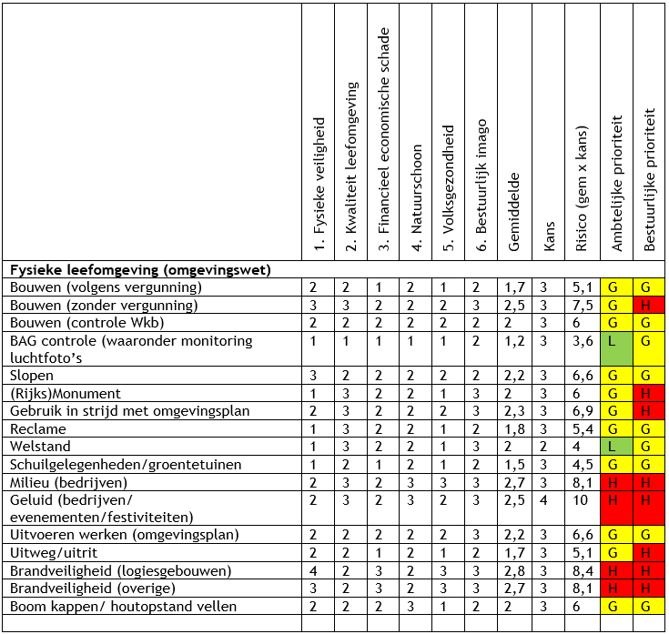 Op basis van de risicomatrix zijn door het college de volgende prioriteiten per werkgebied vastgesteld: