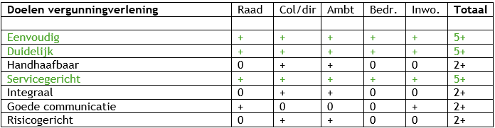 Uit de tabel is af te leiden dat men eenvoudige, duidelijke en servicegerichte vergunningverlening verwacht. Daarnaast moeten de vergunningen handhaafbaar, integraal en risicogericht zijn en er wordt aangegeven dat er een goede communicatie rondom de vergunningverlening aanwezig moet zijn. Dit krijgt een vertaling naar praktische doelen bij in hoofdstuk 3 Vergunningverlening.