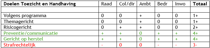Uit de tabel blijkt dat men preventie door communicatie belangrijk vindt en dat toezicht en handhaving primair gericht moet zijn op herstel. Verder dient het risicogericht te zijn, kan het volgens programma of themagericht zijn. Strafrechtelijke handhaving wordt als minder gewenst beschouwd. Deze doelen krijgen een vertaling naar praktische doelen in hoofdstuk 4 Toezicht en Handhaving.