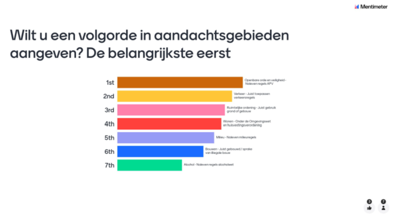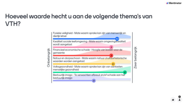 De raadssessie gaf een duidelijk beeld dat openbare orde en veiligheid veel prioriteit hebben bij VTH. De dorpskommen en met name de beschermde dorpskommen hebben daarbij veel aandacht. Participatie en servicegerichtheid lijken voor de raad de belangrijkste doelen bij vergunningverlening. Toezicht bij vergunningen of meldingen scoorde het hoogst om een controle te starten. Tot slot lijkt de voorkeur uit te gaan naar preventie en begeleiding en bestuursrechtelijke handhaving gericht op herstel. Onderstaand zijn de resultaten van deze raadsessie weergegeven.