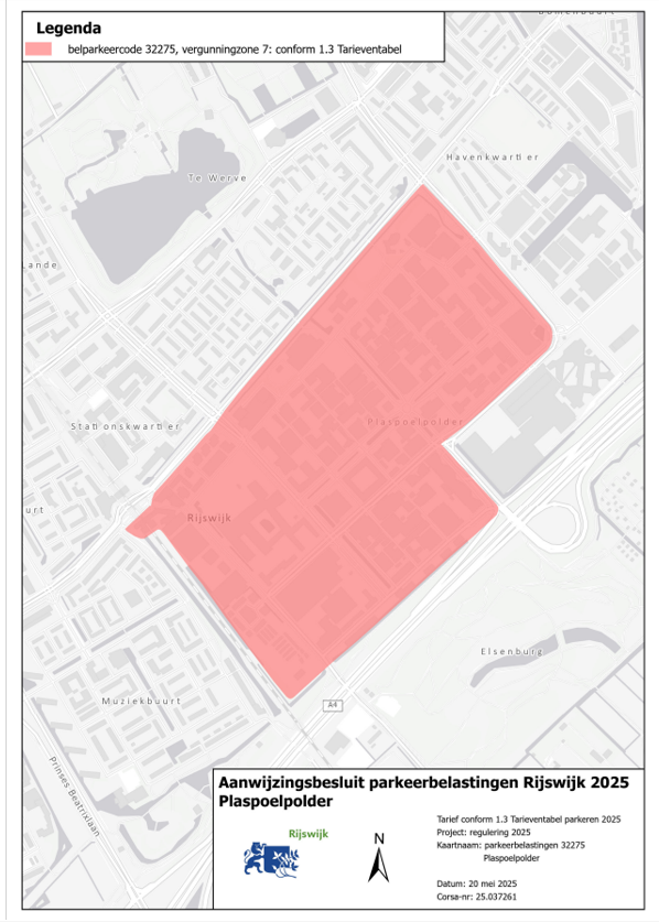 besluit van het college van burgemeester en wethouders d.d. 20 mei 2025, houdende vaststelling van het aanwijzingsbesluit parkeerbelastingen gemeente Rijswijk 2025 Plaspoelpolder.
