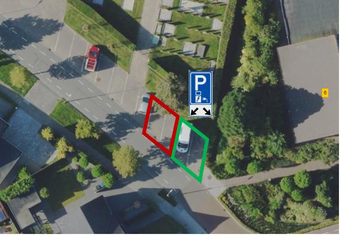 Bijlage 1. Aanwijzen van vier parkeerplaatsen voor het opladen van elektrische voertuigen ten westen van Biezelingseweg 6 in Biezelinge, door plaatsing van verkeersbord E8c van Bijlage I van het Reglement verkeersregels en verkeerstekens 1990 (RVV 1990) met onderbord OB504 VNVF (neerwijzende pijlen). In eerste instantie wordt één laadpaal geplaatst (groene vakken), waarmee twee elektrische voertuigen tegelijkertijd kunnen laden.