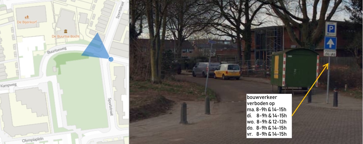 De aanleiding voor het plaatsen van het onderbord onder C4 op de Buurtseweg is de bouw van woningen aan de Spelstraat/Churchillweg. Er is een afvoerroute voor het bouwverkeer via de Buurtseweg. Daarbij hebben we met de bouwer afgesproken om de tijden van het in- en uitgaan van de school te vermijden. Maar er zijn leveranciers en dergelijken die zich niet houden aan de afspraak met het bouwbedrijf. Om te zorgen dat de schoolkinderen beschermd zijn, voeren we dit verbod in. Alle bouwverkeer moet zich dan houden aan de afspraken.