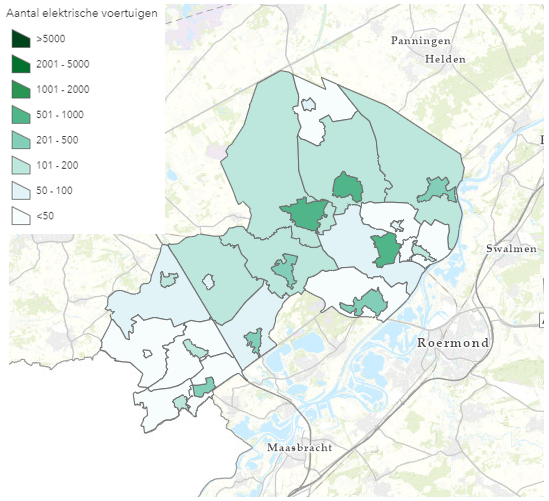 Waar nu nog een relatief klein aantal elektrische auto’s rondrijdt in Leudal, zal dat in de komende jaren sterk veranderen. De prognose is dat in 2030 bijna 5.500 elektrische voertuigen zullen rondrijden (figuur 4). In 2050 zal dit aantal verder groeien naar bijna 22.000. Het aantal elektrische voertuigen verschilt per gebied in onze gemeente (figuur 5).