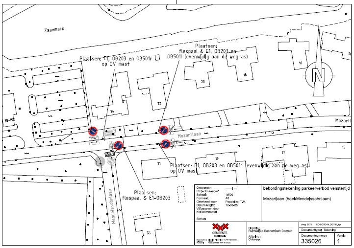 Het verkeersbesluit ‘Instellen parkeerverbod met venstertijden aan oostzijde Mendelssohnlaan te Breda’ van 18 november 2024 gedeeltelijk te wijzigen en in verband hiermee het bord E01, parkeerverbod, met onderbord OB208C ‘ma t/m vr 8-16h’ en onderbord OB501L/OB501R twee keer op de Mozartlaan ter hoogte van de kruising met de Mendelssohnlaan en twee keer ter hoogte van Mozartlaan 21 te plaatsen.