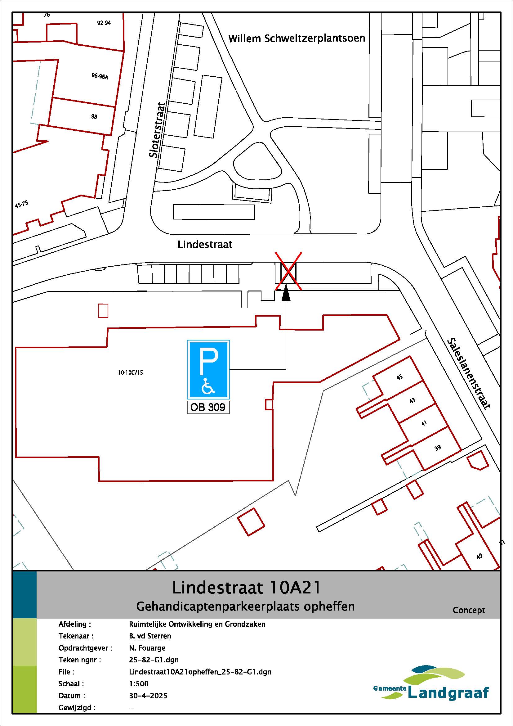 De gemeente heeft een verzoek ontvangen voor het intrekken van een gehandicaptenparkeerplaats op kenteken nabij de Lindestraat 10A21.
