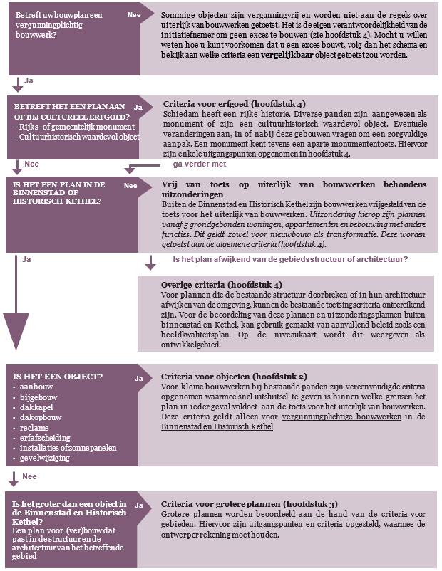 De nota is opgesteld als praktisch beoordelingskader met criteria voor het bespreken en beoordelen van plannen. Wie wil weten welke criteria op een aanvraag van toepassing zijn, doorloopt het stroomschema op pagina 6. De criteria betreffen het bouwwerk op zichzelf en gezien in zijn omgeving. De foto’s in de nota zijn bedoeld als illustratie bij de beschrijvingen, niet als afbeelding van de gewenste eigenschappen.