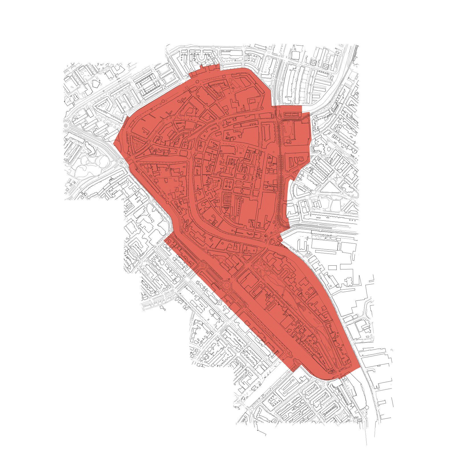 Dit gebied is een menging van historische structuren en objecten met structu- ren en bebouwing uit de jaren ‘70 en ‘80. De singels en grachten in deze buurt, zoals aan de Breedstraat/Raam, zijn in de loop der tijd gedempt, een groot deel van de bebouwing is vervangen. De sfeer wordt enerzijds bepaald door de nog aanwezige branderijen en andere vormen van bedrijvigheid en anderzijds door de diverse appartementengebouwen met stedelijke voorzieningen op de bega- ne grond en daaronder vaak een eigen parkeergarage. Deze gebouwen hebben een maat die de kleinschaligheid van de oorspronkelijke buurt overstijgt. De opbouw bestaat uit drie of vier lagen met in de regel een kap. De detaillering is eenvoudig en per blok in samenhang. De gebruikte kleuren hebben veel schakeringen en zijn enigszins afgestemd op de kleurstellingen in de historische stad.