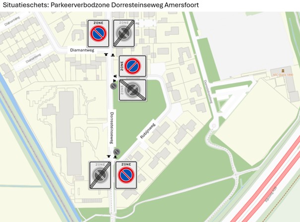 Door een parkeerverbodszone in te stellen op de Dorresteinseweg wordt voorkomen dat voertuigen op de weg geparkeerd staan en wordt de doorgang van het verkeer gewaarborgd. Dit parkeerverbod wordt gerealiseerd door ter hoogte van het kruispunt van de Dorresteinseweg met de Diamantweg en ter hoogte van de Dorresteinseweg met de Robijnweg de borden E1 (begin/einde zone) van bijlage 1 van het RVV 1990 te plaatsen. Door een parkeerverbodszone in te stellen worden de bestaande borden E1 overbodig, en kunnen deze verwijderd worden.