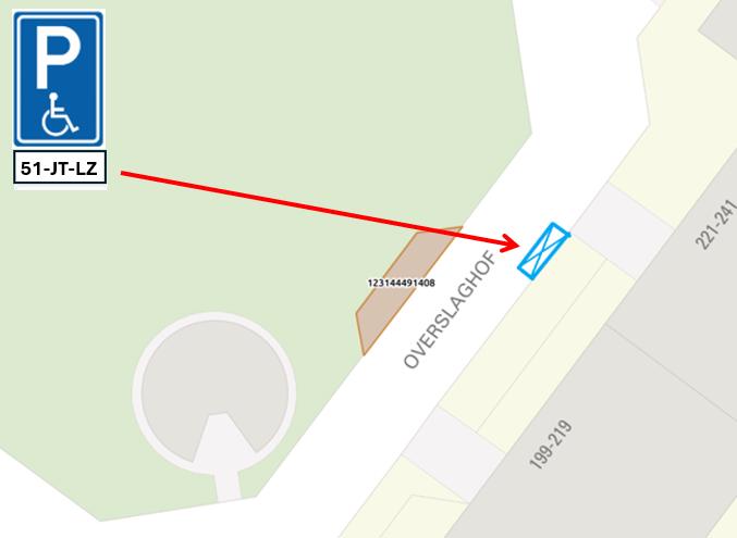 Door het plaatsen van verkeersbord conform model E6 (gehandicaptenparkeerplaats) van Bijlage I van het RVV 1990, voorzien van een onderbord met kenteken 51-JT-LZ en het aanbrengen van ondersteunende markeringen (RVV 1990), in te stellen: een gehandicaptenparkeerplaats ter hoogte van perceel Overslaghof 229, uitsluitend bestemd voor het door vergunninghouder in gebruik zijnde motorvoertuig met het op het onderbord vermelde kentekennummer.