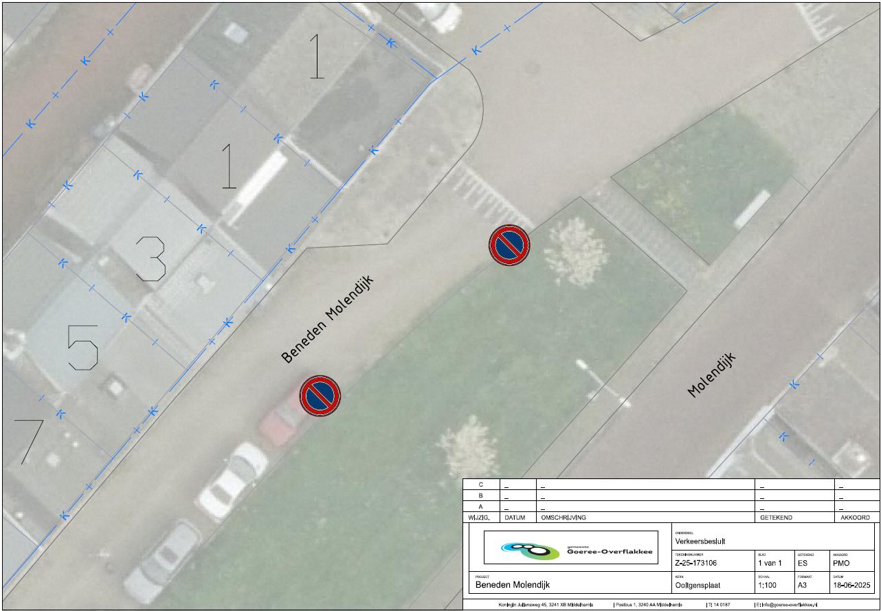 tot het instellen van een parkeerverbod op de Beneden Molendijk aan de overzijde van de weg ter hoogte van de woningen Zuid Achterweg 1 en Tuinstraat met huisnummers 1 t/m 3 te Ooltgensplaat, door het plaatsen van verkeersborden E01 conform model van bijlage I van het Reglement Verkeersregels en Verkeerstekens 1990;