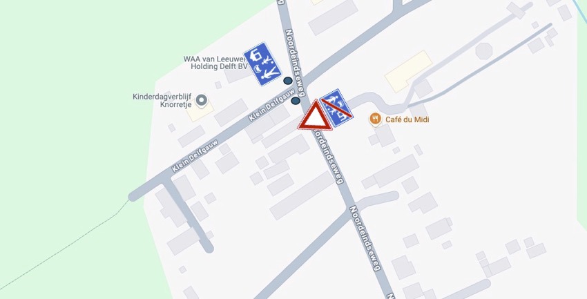 door het aanbrengen van haaientanden en het plaatsen van het bord B6 van Bijlage I van het RVV 1990 wordt aangegeven dat het verkeer op Klein Delfgauw voorrang dient te verlenen aan het verkeer op de Noordeindseweg;