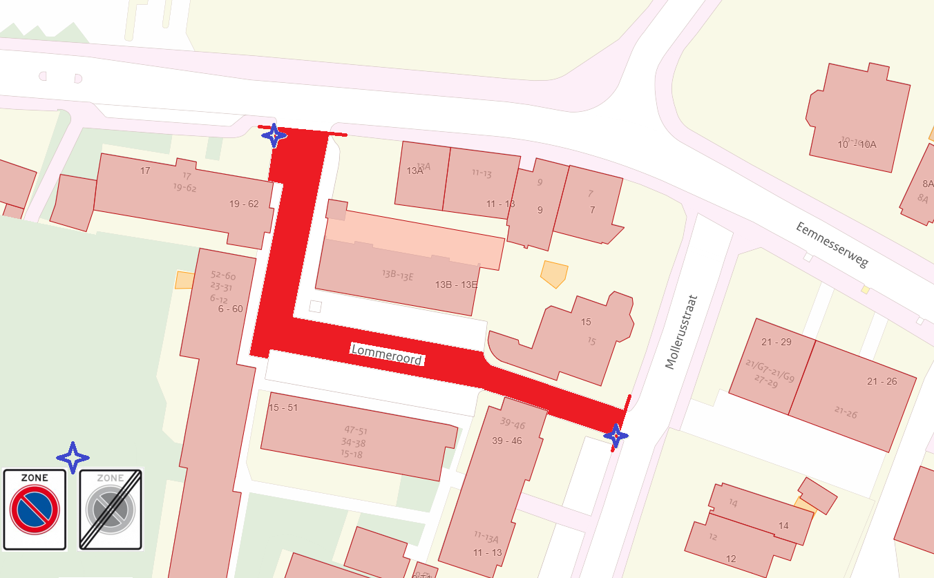 middels van het plaatsen van nieuwe borden E1 (parkeerverbod) van bijlage I van het RVV-1990 voorzien van het woord «zone» aan de bovenzijde, zoals bedoeld in artikel 66 van het RVV-1990, aan de aansluitingen van Lommeroord op de Eemnesserweg en de Mollerusstraat een parkeerverbod zone in te voeren op Lommeroord. De aangegeven ruimte staat in de hieronder bijgevoegde schets.