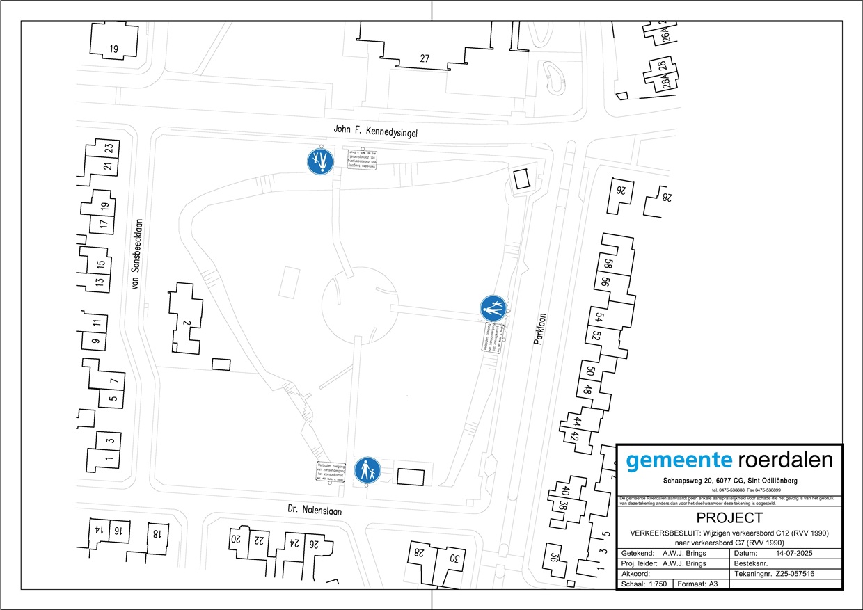 De geldende geslotenverklaring voor alle motorvoertuigen te wijzigen door verwijderen van verkeersbord C12 (RVV 1990) in een verplicht voetpad door het plaatsen van het verkeersbord G7 (RVV 1990). Uitvoering conform situatietekening Z25-057516.