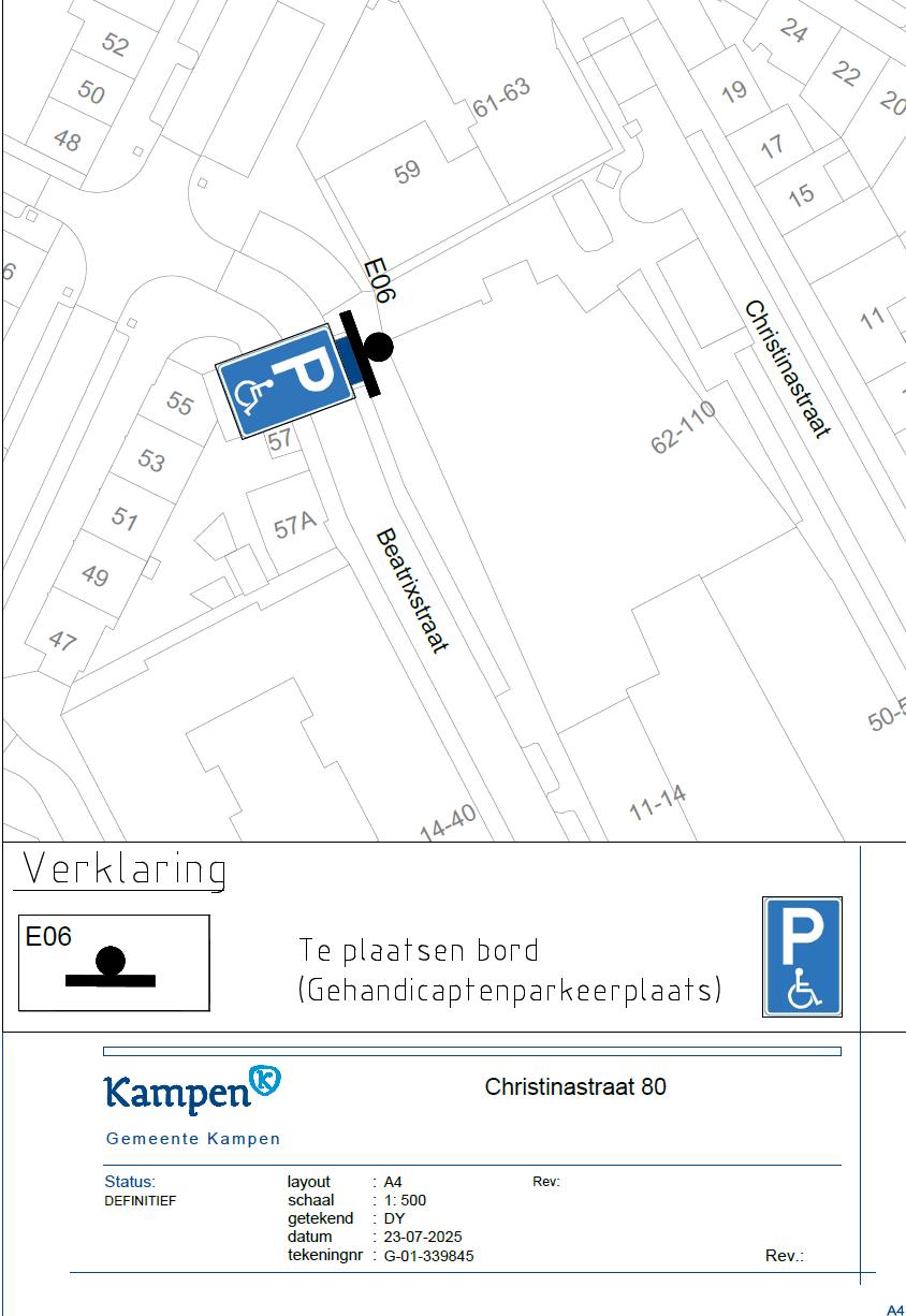 - nabij de Christinastraat 80 in Kampen één openbare parkeerplaats aan te wijzen als gehandicaptenparkeerplaats op kenteken door het plaatsen van een verkeersbord conform het model E6 van bijlage 1 RVV 1990 inclusief onderbord met het kenteken van het voertuig;