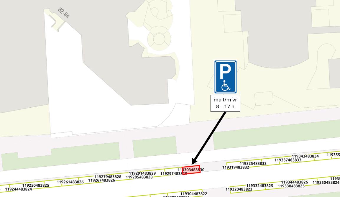 Door het plaatsen van verkeersbord conform model E6 van Bijlage I van het RVV 1990, voorzien van een onderbord met de tekst ‘ma t/m vr 8 – 17 h’, aan te wijzen: een algemene gehandicaptenparkeerplaats gedurende de venstertijden van maandag tot en met vrijdag tussen 8.00 en 17.00 uur in de Fred. Roeskestraat, ter hoogte van perceelnummer 85 (parkeervaknummer 119303483830).
